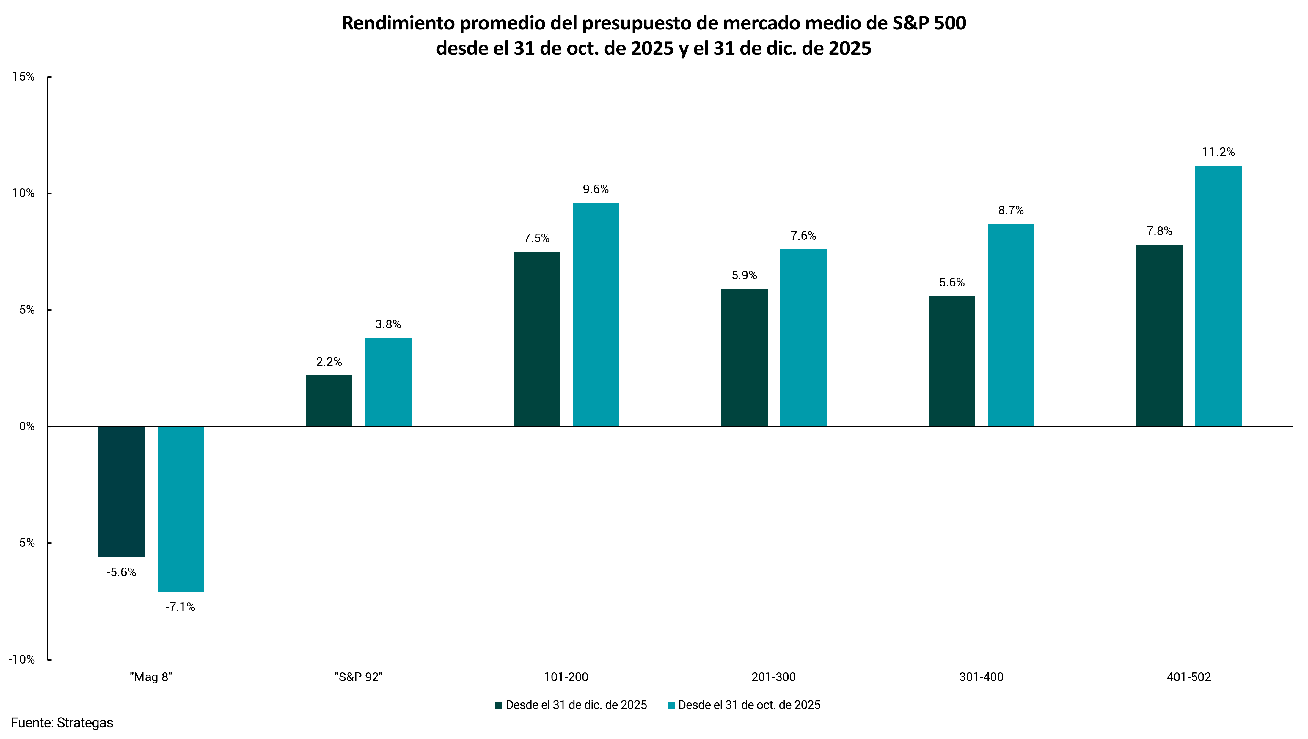 - Las acciones "Mag 8" se han vuelto negativas, mientras que las otras compañías del S&P 500, y especialmente las 100 más pequeñas, están ofreciendo rendimientos positivos.